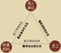 劳动派遣的最显著特征就是劳动力的雇用和使用分离。劳动派遣机构已经不同于职业介绍机构,它成为与劳动者签订劳动合同的一方当事人。下面是劳务派遣结构示意图。